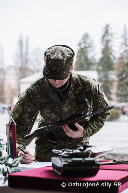 Vojenská prísaha v Základni výcviku a mobilizačného doplňovania Martin Aktom vyradenia so slávnostným potvrdením zloženia vojenskej prísahy ukončilo 18. novembra v Základni výcviku a mobilizačného doplňovania Martin svoju prípravu v ozbrojených silách Slovenskej republiky („ďalej len OS SR“) celkovo 131 nových profesionálnych vojakov, z toho 33 žien základného vojenského výcviku. Vojenskej prísahy sa zúčastnili náčelník Generálneho štábu OS SR generál Daniel Zmeko, hlavný poddôstojník OS SR štábny nadrotmajster Marcel Kaniak, veliteľ Pozemných síl OS SR generálmajor Ivan Pach, ako aj ďalší vážení hostia. „Vojenská prísaha je rozhodujúci mravný záväzok. Zdôrazňuje základné požiadavky na vojenskú morálku, ktoré na seba dobrovoľne beriete. Jej zloženie je verejným vyhlásením Vášho odhodlania zaisťovať bezpečnosť a suverenitu Slovenskej republiky. Vojenská prísaha Vás zároveň zaväzuje k naplneniu najvyšších občianskych a vojenských hodnôt. Vaša služba vlasti si vyžaduje byť pripravený na Vaše nasadenie na jej obranu,“ povedal vo svojom príhovore veliteľ základne plukovník Pavol Barančík. Po vykonanom akte vojenskej prísahy sa novým profesionálom prihovoril náčelník Generálneho štábu OS SR generál Daniel Zmeko. Najlepším absolventom základného vojenského výcviku sa stala čakateľka vojačka 1. stupňa Silvia Vargová, ktorej veliteľ základne plukovník Pavol Barančík udelil najvyššie morálne ocenenie - zápis do kroniky útvaru. Následne hlavný poddôstojník OS SR štábny nadrotmajster Marcel Kaniak ocenil najlepšieho inštruktora základného vojenského výcviku čatára Miroslava Bobota. Na záver slávnostného aktu odovzdal náčelník Generálneho štábu OS SR a hlavný poddôstojník OS SR pamätné mince deviatim najlepším absolventom základného vojenského výcviku za výborné dosiahnuté výsledky počas celého základného výcviku a šiestim inštruktorom výcviku za vzornú prípravu, zabezpečenie a vykonanie základného vojenského výcviku.