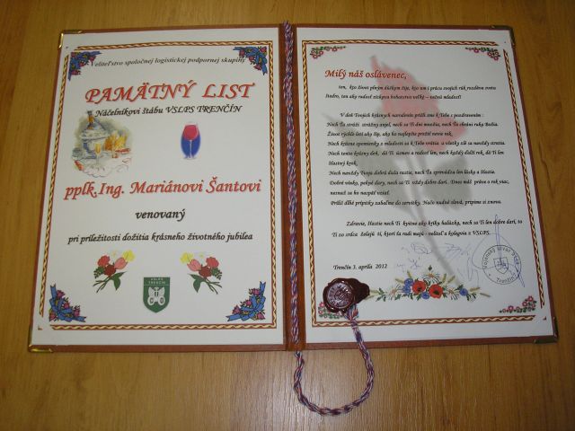 Zdravie, šťastie nech Ti  kvitne ako kríku halúzka, nech sa Ti len dobre darí, to Ti zo srdca želajú  tí, ktorí ťa radi majú - veliteľ a kolegovia z VSLPS