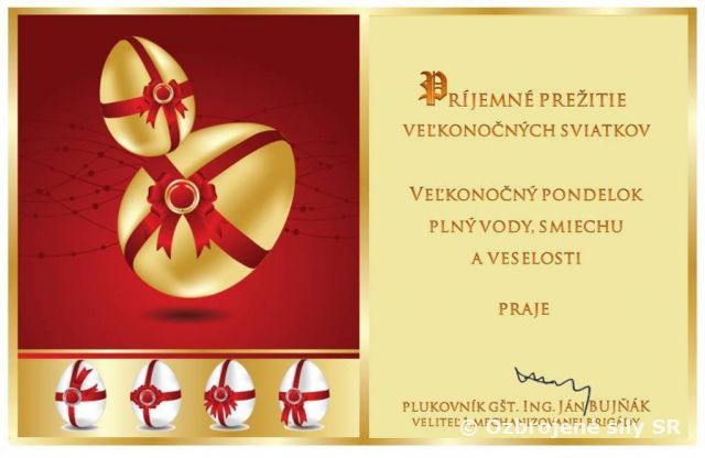 Pre nás príslušníkov 1. mechanizovanej brigády nastáva obdobie plnenia náročných a mnohokrát neočakávaných úloh. Preto mi dovoľte zaželať Vám, aby ste nastávajúce Veľkonočné sviatky prežili v pokoji, v kruhu svojich rodín a aby ste načerpali množstvo energie a sily potrebnej k vašej činorodej práci.