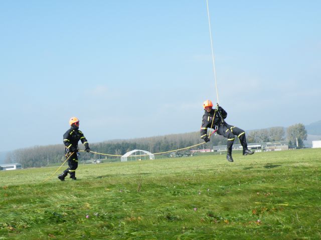 Pod dohľadom práporčíka Milana Kocíka, náčelníka padákovej a záchrannej služby,  hasiči niekoľkokrát zlanili z výšky 30 až 40 metrov. Veľmi dôležitou súčasťou pri tejto činnosti je komunikácia medzi zlaňujúcimi a osádkou vrtuľníka. Keďže použitie komunikačnej techniky nie je v tomto prípade možné, vojenskí hasiči museli pri dorozumievaní používať znakovú reč. Ďalšou z tém výcviku bol presun v podvese v trojčlenných skupinách, či prenos ranenej osoby na lehátku. Takýto spôsob evakuácie sa často krát  využíva v prípadoch, keď je ranený v ťažko dostupnom teréne a pristátie vrtuľníka nie je možné. Aj pri tejto činnosti je komunikácia medzi záchranármi v podvese a operátorom na palube vrtuľníka jednou z najdôležitejších úkonov potrebných pre úspešný zásah.