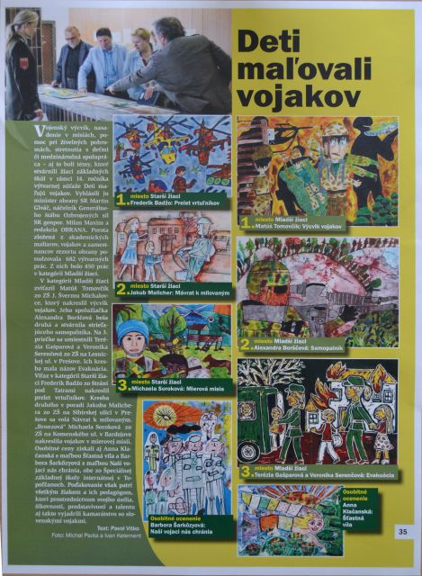 Víťaz v kategórii Starší žiaci Frederik Badžo zo Strání pod Tatrami nakreslil prelet vrtuľníkov. Kresba druhého v poradí Jakuba Malichera zo ZŠ na Sibírskej ulici v Prešove sa volá Návrat k milovaným. „Bronzová“ Michaela Soroková zo ZŠ na Komenského ul. v Bardejove nakreslila vojakov v mierovej misii.