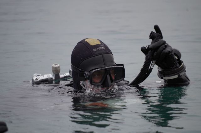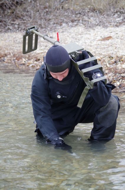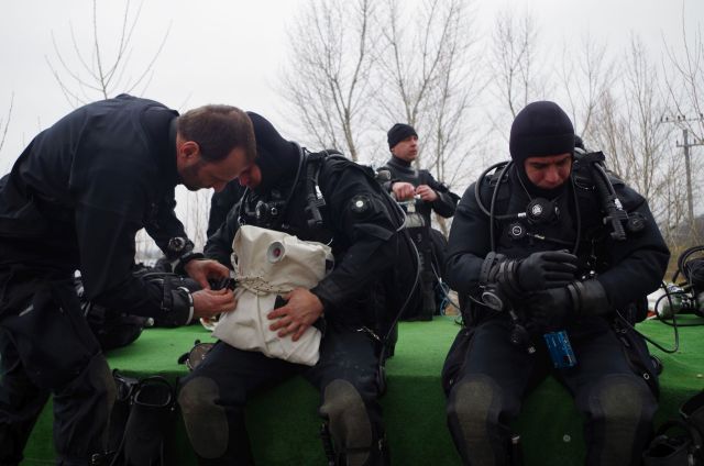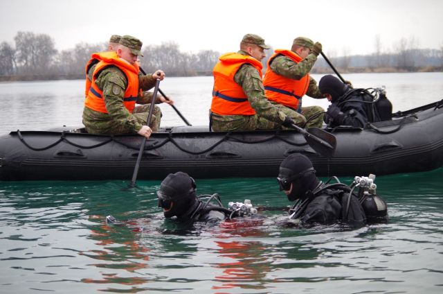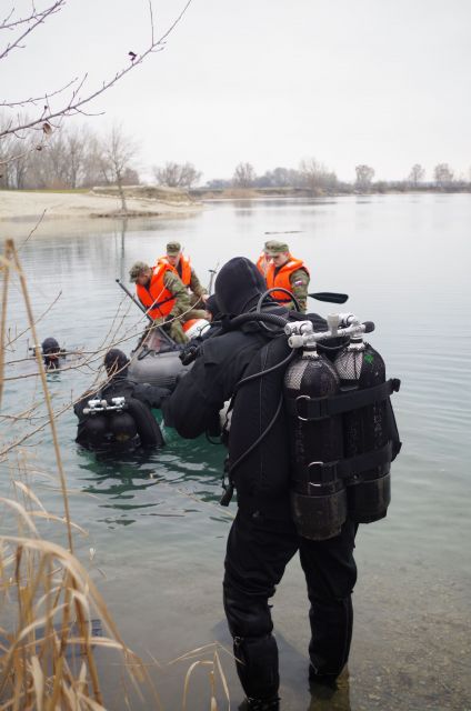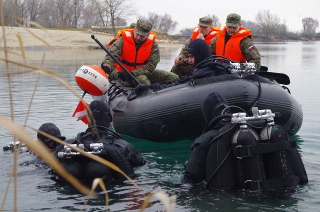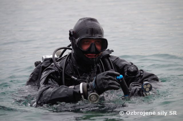Najväčšia potápačská jednotka našich ozbrojených síl zo seredského ženijného práporu v tomto týždni zavŕšila sériu praktického výcviku v zimných podmienkach pod vodou. V priestoroch bagroviska Čierna Voda, kde sa môžu ponárať až do hĺbky vyše 37 metrov plnilo úlohy ženijné potápačsko-prieskumné družstvo. Riadiaci zamestnania, veliaci poddôstojník ženijno-prieskumnej čaty a inštruktor vojenského potápania OS SR rotmajster Michal Ščepko objasňuje, že úlohou potápačov je vyhľadávanie, vyzdvihnutie a odsun utopenej techniky.