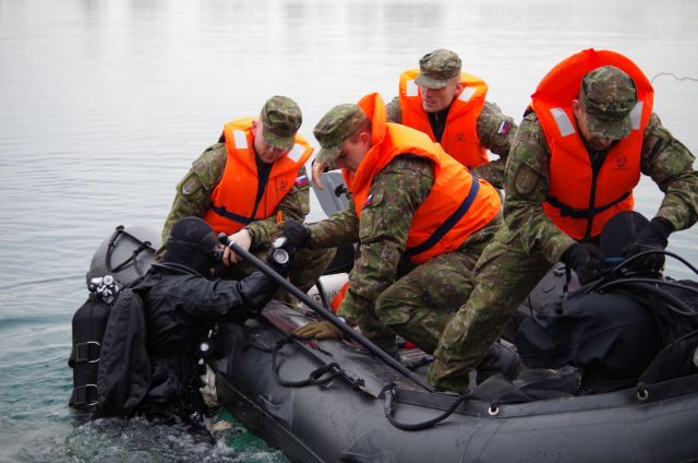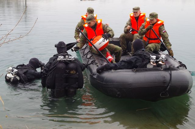 Potápači, rozdelení do dvoch skupín musia najskôr nájsť predmet, ktorý sa pri simulácii bojovej činnosti vo vodnej ploche utopil. Ide o vojenský čln. Treba ho veľmi rýchlo nájsť, označiť a pomocou vynášacích vakov vytiahnuť na hladinu a potom odsunúť na druhý breh. Ide o nepreverený priestor. Preto ho najskôr musí prieskumná skupina vytýčiť, prehľadať špeciálnymi mínohľadačkami a následne označiť ako čistý. Pod vedením slobodníka Juraja Kováča preskúmali aj dno vodnej prekážky až do hĺbky cca 1,5 metra.