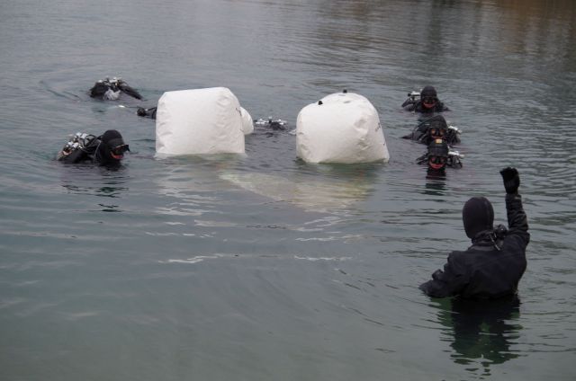 Úlohu nájsť utopený člne plnila prvá skupina potápačov pod vedením veliteľa ženijného potápačsko-prieskumného družstva rotného Vladimíra Budu. Potápačov čakali nie práve ideálne podmienky. Vzduch mal 7 stupňov, fúkal mierny juhovýchodný vietor, teplota vody 2 stupne a viditeľnosť na dne bagroviska od nuly až po 2 metre. Seredskí potápači sú pripravení a vyškolení plniť úlohy aj v takýchto podmienkach. Pri vyhľadávaní a zabezpečovaní techniky musia zabezpečiť, aby sa im predmet nestratil v kale na dne vodnej plochy. Musia postupovať rýchlo, no opatrne. Práve preto je taká dôležitá správna činnosť prvej skupiny, ktorá pod hladinou na dne predmet vyhľadáva a vyznačuje. Musia to byť najskúsenejší potápači, aby pripravili čo najlepšie podmienky na rýchlu evakuáciu predmetu spod vody.