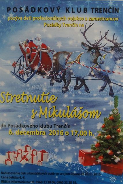 Stretnutie s Mikulášom Magický deň predovšetkým pre tých najmenších je 6. december. Deň, ktorý nesie v kalendári meno Mikuláš má čarovnú moc, ktorou dokáže rozžiariť oči i dušu azda všetkých detí. Ako po minulé roky, tak aj tento rok pripravil Posádkový klub Trenčín dňa 6.decembra 2016 bohatú mikulášsku nádielku pre deti zamestnancov a profesionálnych vojakov posádky Trenčín . Mikuláš zavítal aj so svojimi nerozlučnými spoločníkmi, anjelom a čertom. Na plný kôš sladkých dobrôt sa tešilo takmer 150 detí.