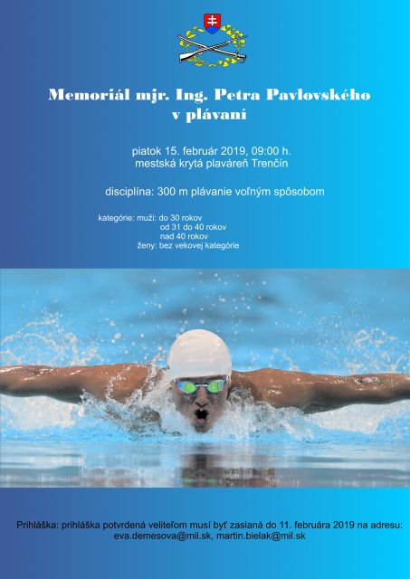 Piatok 15. februára 2019 so začiatkom o 09.00 hodine sa v Mestskej krytej plavárni v Trenčíne uskutoční 0. ročník Memoriálu majora Ing. Petra Pavlovského v plávaní. Súťažiť sa bude v disciplíne 300 metrov plávanie voľným štýlom v troch vekových kategóriách muži (do 30 rokov, 31 až 40 rokov a nad 40 rokov) a v jednej ženskej kategórii. Záujem zúčastniť sa na podujatí potvrďte zaslaním prihlášky potvrdenej veliteľom na e-mail eva.demesova@mil.skmartin.bielak@mil.sk do 11. februára 2019.