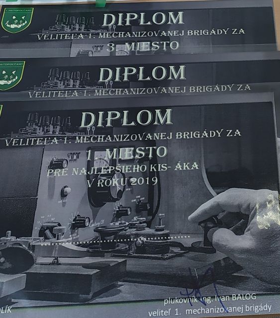 Víťazovi Súťaže o najlepšieho KIS-áka 1.mechanizovanej brigády pre rok 2019 odovzdal putovný pohár veliteľa 1. mechanizovanej brigády a diplomy pre 1. až 3. miesto náčelník BOIaKIS 1. mechanizovanej brigády major Milan Sokolík.