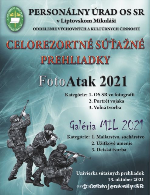 Personálny úrad OS SR v spolupráci s redakciou mesačníka Obrana vyhlasuje v roku 2021 celorezortné súťažné prehliadky pre profesionálnych vojakov Ozbrojených síl SR, zamestnancov rezortu obrany, rodinných príslušníkov, ako aj vojenských dôchodcov. Prvou súťažnou prehliadkou je FotoAtak. Má tri kategórie, a to OS SR vo fotografii, Portrét vojaka a Voľná tvorba. Druhou súťažnou prehliadkou je Galéria MIL, s kategóriami Maliarstvo, sochárstvo, Úžitkové umenie a Detská tvorba.