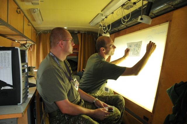 V ďalšom stane sú umiestnené pracovné stanice so systémom velenia a riadenia, na ktorých je zobrazená mapa s nákresom situácie. Áno, svoje zastúpenie na tomto cvičení má aj C2 systém, ktorý umožňuje na základe posielaných informácií v elektronickej forme z rôznych iných systémov tieto údaje spracovať a zobraziť. C2 systém je zapojený do testovania s krajinami: Litva, USA, Ukrajina, Chorvátsko a Moldavsko. Vedľa stanu stojí obrnený transportér ALIGATOR, ktorý práve vyráža. Prostredníctvom GPS modulu ktorým disponuje, môžeme sledovať jeho pohyb na mape. Ide o testovanie sledovania pohybu vlastných vojsk (Blue Force Tracking).