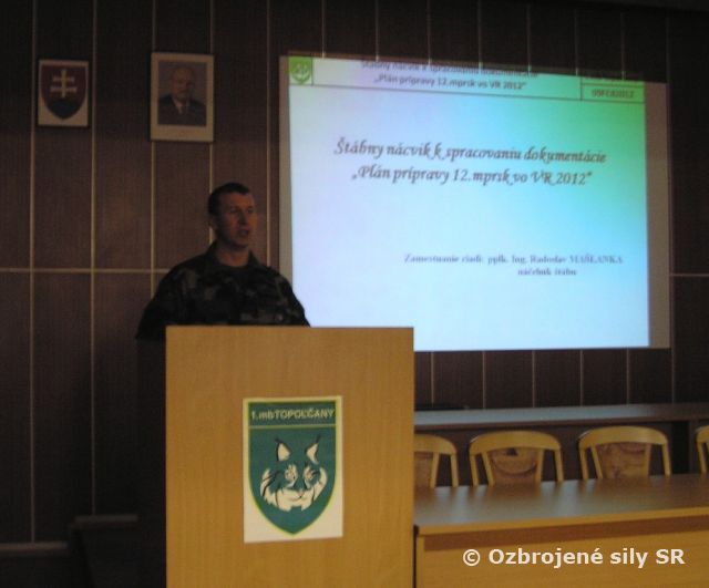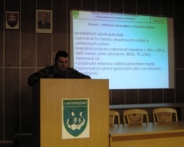 Dňa 9. februára 2012 privítal náčelník štábu 1. mechanizovanej brigády (1.mb) podplukovník Radoslav MAŠLANKA, ako riadiaci zamestnania, účastníkov štábneho nácviku (ŠN) konaného v posádke Topoľčany, ktorého cieľom bolo zistiť aktuálny stav pripravenosti jednotiek 12. mechanizovanej práporovej skupiny (12.mprsk), vykonať prezentáciu a následné spripomienkovanie dokumentu „Plán prípravy 12.mprsk vo výcvikovom roku 2012“. Tohto zamestnania sa okrem určených príslušníkov veliteľstva a štábu 1.mb zúčastnili aj hlavní funkcionári 12. mechanizovaného práporu Nitra, príslušníci práporu logistickej podpory Topoľčany, raketometného oddielu Rožňava, samohybného delostreleckého oddielu Michalovce, ženijného práporu Sereď a príslušníci taktického PSYOPS tímu práporu podpory velenia pozemných síl Trenčín.