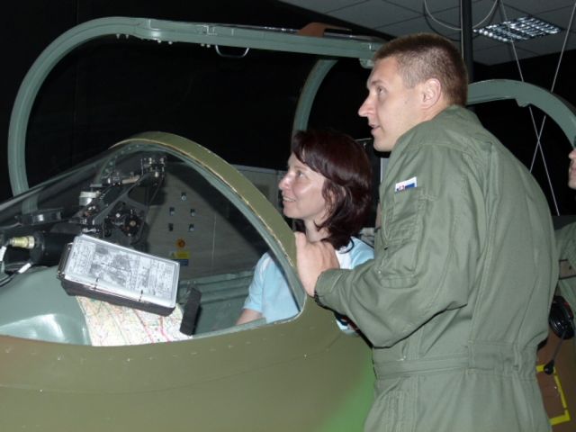 Nadšení študenti a učitelia pokračovali svojou návštevou v priestoroch trenažérového centra, kde mali možnosť absolvovať simulačný let na simulátoroch lietadiel L-39 a MiG-29. Technici nadpráporčík Branislav PERŽEL a podráporčík Miroslav BESKYD a piloti poručík Martin ŠIRKO a poručík Martin POKLEMBA oboznámili deti so základným ovládaním simulátora a potom už deti mohli absolvovať let. I napriek tomu, že návšteva trenažérového centra nebola hlavným dôvodom, prečo žiaci navštívili leteckú základňu, mala u mladých vedcov ohromný úspech.