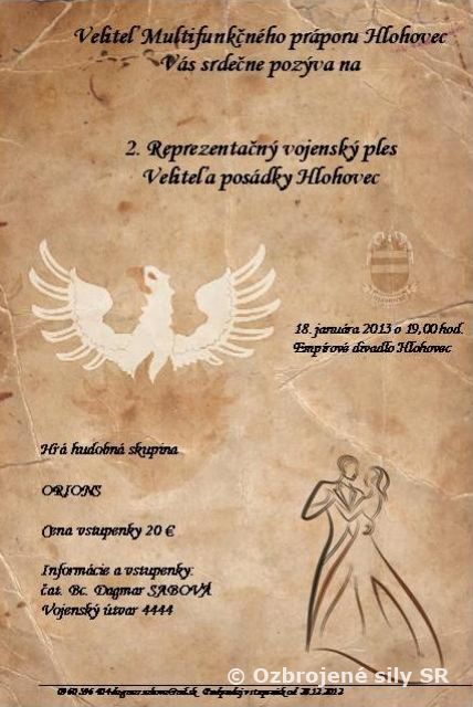 Veliteľ Multifunkčného práporu Hlohovec Vás srdečne pozýva na 2. Reprezentačný vojenský ples Veliteľa posádky Hlohovec, ktorý sa bude konať dňa 18. januára 2013 o 19,00 hod. v Empírovom divadle Hlohovec. O zábavu sa postará hudobná skupina ORIONS. Cena vstupenky 20 €.