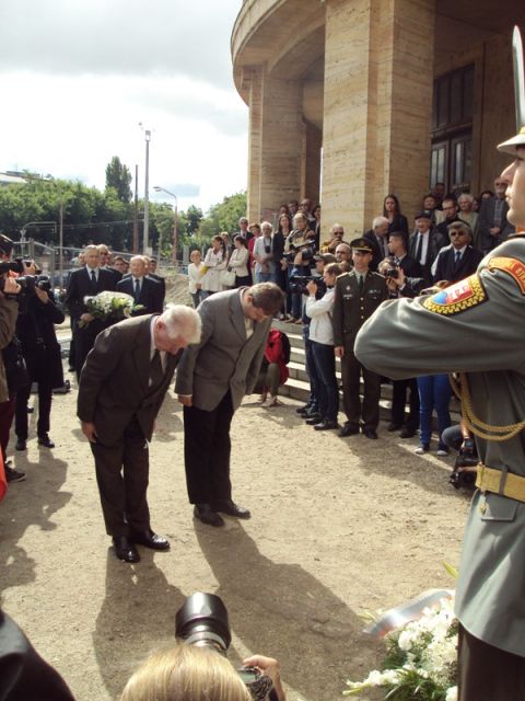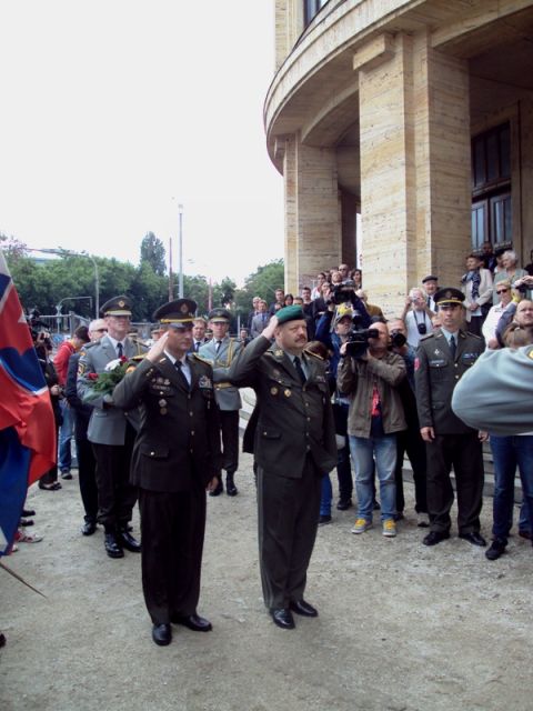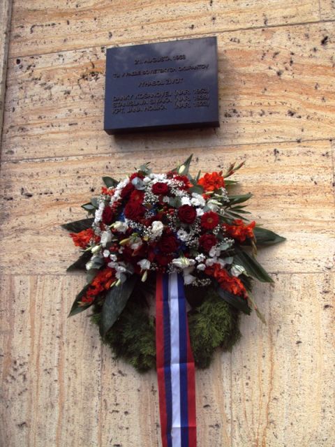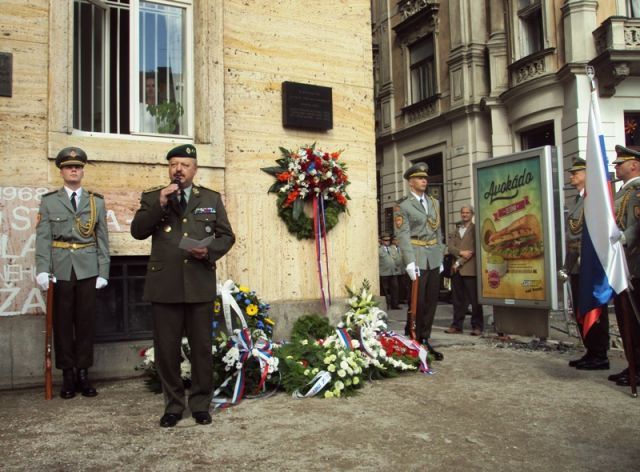 Vence hostí k pamätnej tabuli, venovanej obetiam vpádu vojsk Varšavskej zmluvy na naše územie, položili príslušníci Čestnej stráže OS SR za melodického sprievodu hudobníkov bratislavskej vojenskej hudby.