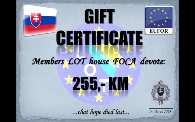 A aj práve preto sa príslušníci slovenského styčného a pozorovacieho tímu (LOT) vo Foči rozhodli pomôcť. Zorganizovali finančnú zbierku, ktorú venovali regionálnej organizácii Červeného kríža vo Foči zastúpeného pani Snjezanou Kovac. Pracovníci Červeného kríža za pomoci príslušníkov LOT zabezpečili nákup základných životných potrieb ako sú potraviny, hygienické potreby a šatstvo pre jednu mladú rodinu, ktorá sa nie vlastnou vinou ocitla v sociálnej núdzi. Túto pomoc v sprievode pani Snjezane Kovac odovzdali dňa 23. marca 2015 veliteľ LOT Foča major Jozef Trochan a veliteľ tímu kapitán Andrej Kukla rodine v Popovom Moste.