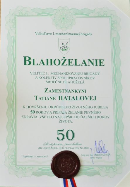Veliteľ 1.mechanizovanej brigády brigádny generál Vladimír Kubáň zorganizoval dňa 21. marca v priestoroch Siene cti a tradícii v Jaselských kasárňach stretnutie s profesionálnymi vojakmi a zamestnancami aby spoločne zablahoželali kolegyni Tatiane Hatalovej, ktorá sa dožíva krásneho okrúhleho životného jubilea - päťdesiat rokov.