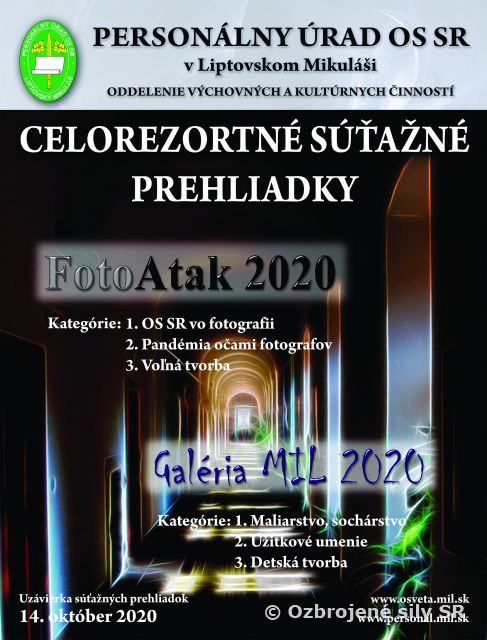 Personálny úrad OS SR v spolupráci s redakciou mesačníka Obrana vyhlasuje v roku 2020 celorezortné súťažné prehliadky pre profesionálnych vojakov Ozbrojených síl SR, zamestnancov rezortu obrany, rodinných príslušníkov, ako aj vojenských dôchodcov. Prvou súťažnou prehliadkou je FotoAtak. Má tri kategórie, a to OS SR vo fotografii, Pandémia očami fotografov a Voľná tvorba. Druhou súťažnou prehliadkou je Galéria MIL, s kategóriami Maliarstvo, sochárstvo, Úžitkové umenie a Detská tvorba.
