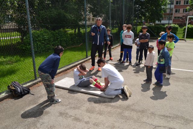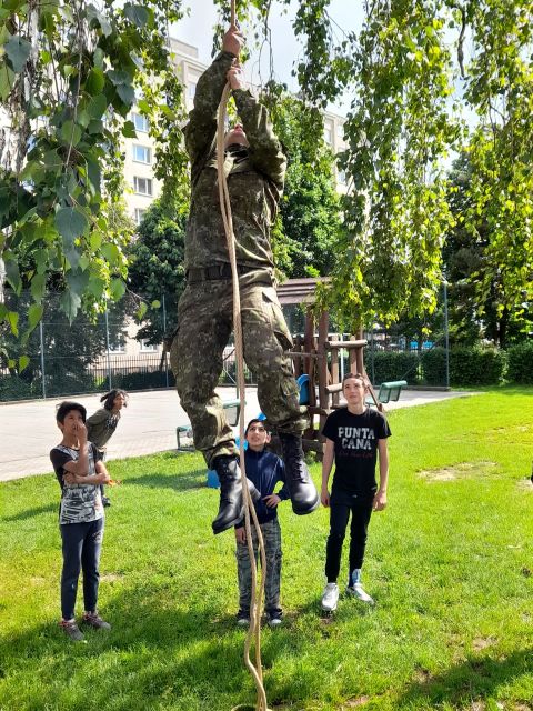 Program odštartoval preskúšaním z pohybovej výkonnosti v ich športovom areáli, ktoré riadil telovýchovný pracovník vrtuľníkového krídla Miroslav Štubňa. Deti museli vykonávať základné disciplíny preskúšania profesionálnych vojakov z telovýchovy – sed-ľah, člnkový beh, skok do diaľky, zhyby na hrazde a 12 min. beh, presne podľa pokynov a na časové normy. Ďalej sme pokračovali šplhaním na lane a súťaži v klikovaní. Veľkou výzvou bol beh s nasadenou maskou a jednorázovou pláštenkou JP-75. Viacerí ju zvládli na výbornú. Po krátkom odpočinku sme pokračovali ukážkami zbrane Sa vz.58, nosného modulárneho systému a chemických ochranných prostriedkov, ktoré používajú vojaci pri výcviku.
